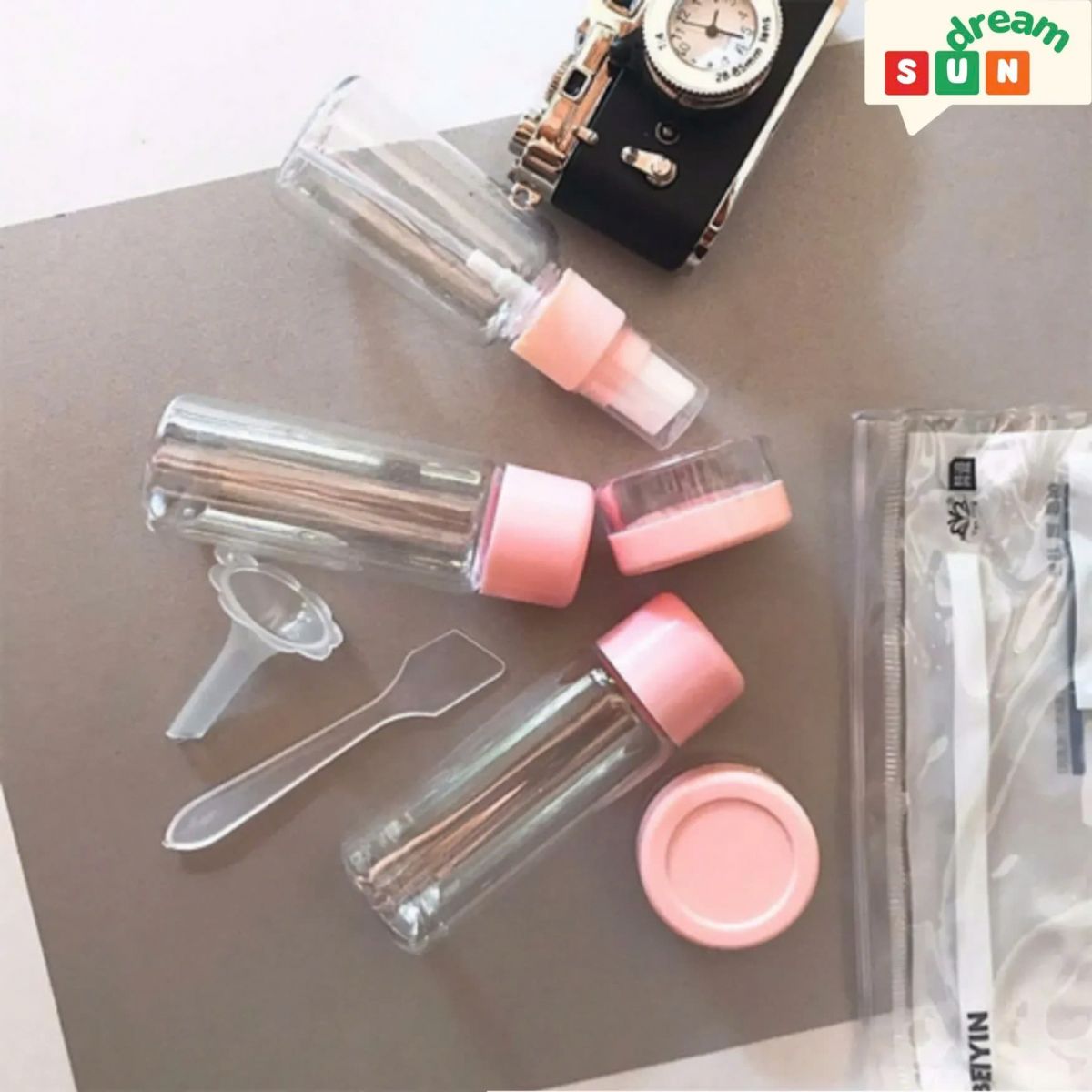 Bộ sản phẩm bao gồm: 2 lọ nhỏ dùng chiết kem dưỡng da, sữa rửa mặt, các loại mỹ phẩm khác, 2 bình chiết để dựng dầu gội, sữa tắm, 1 bình dạng xịt đụng dung dịch dạng lỏng, 1 phễu mini chiết đồ, 1 dụng cụ chiết, 1 mảnh chú thích siêu yêu (ví dụ như là sữa rửa mặt, tẩy da chết.