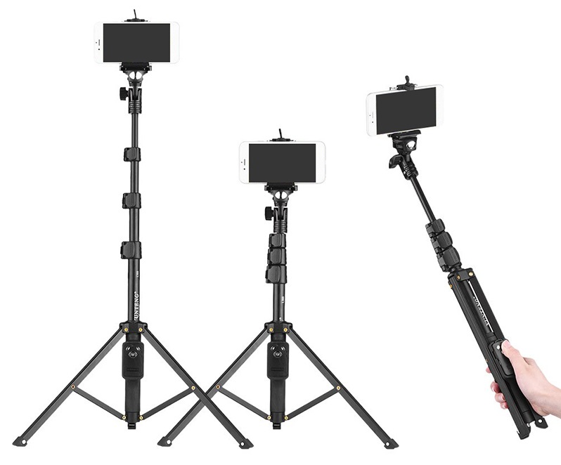 Chân đế chụp hình điện thoại có thiết kế nhỏ gọn tiện dùng mang theo khi đi chơi, chân có thể kéo dài tối đa lên tới 1.34m, và thu gọn chỉ còn 30cm.