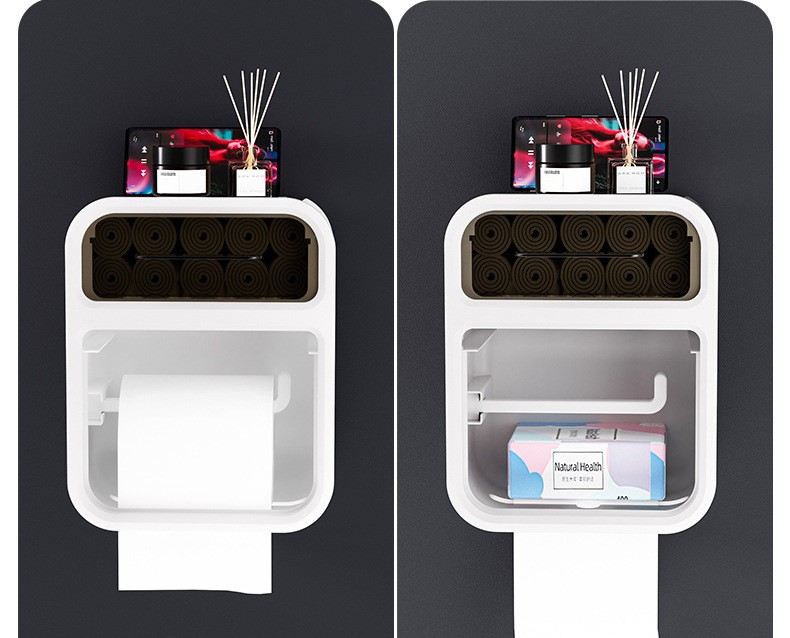 Hộp đựng giấy vệ sinh có kệ đựng điện thoại được thiết kế chống nước, chống trơn trượt, chống rơi và đặt/ để được nhiều vật dụng hàng ngày.