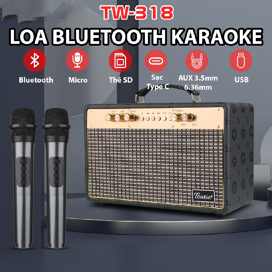 Loa Xách Tay Karaoke Bluetooth Toweiet TW-318 Tặng Kèm 2 Micro Không Dây, Âm Thanh Sóng Động Chất Lượng Cao Cực Hay