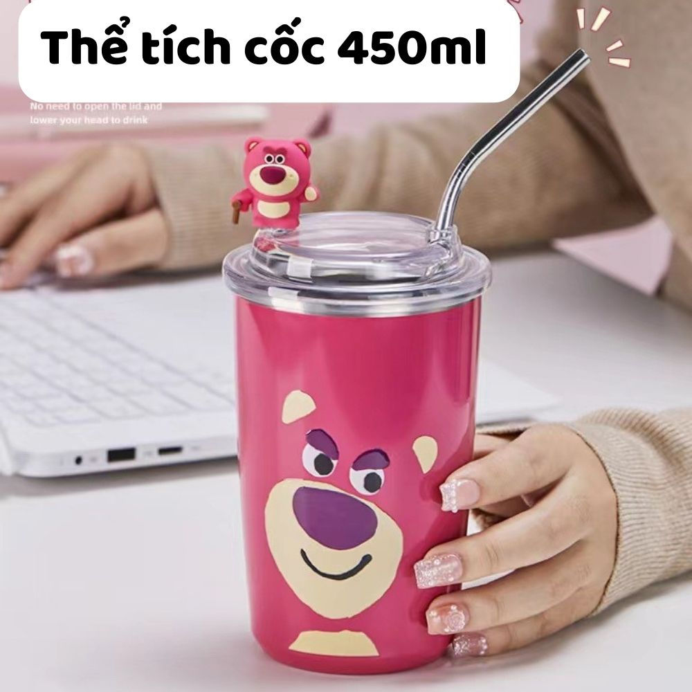 Ly Giữ Nhiệt Inox Hình Gấu Hồng StrawBerry 450Ml Kèm Ống Hút Inox