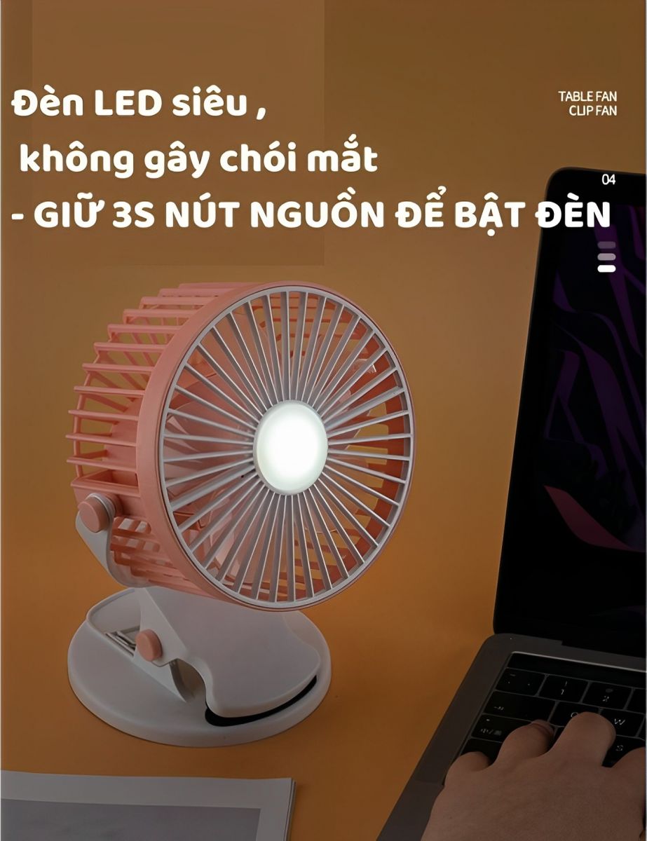 Quạt Kẹp Bàn Pin Sạc Có Đèn Led 3 Chế Độ Siêu Mát Xoay 720 Độ