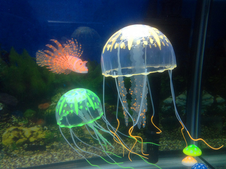 Sản phẩm có hình sứa biển, tạo cảm giác chân thực khi bạn thả xuống bể cá hay thủy cung. Sản phẩm được làm từ chất liệu silicon mềm, dẻo kết hợp với bột huỳnh quang màu giúp nó phát sáng trong bể cá có ánh sáng.Đây là một phụ kiện trang trí bể cá rất tiện dụng và an toàn. Sản phẩm mô phỏng theo hình con sứ giống đến từng chi tiết, màu sắc trong suốt và bột huỳnh quang sẽ phát sáng trong điều kiện có ánh sáng trong bể. Sự chuyển động của con sứa này sẽ làm cho bể cá thêm sinh động, chân thực.
